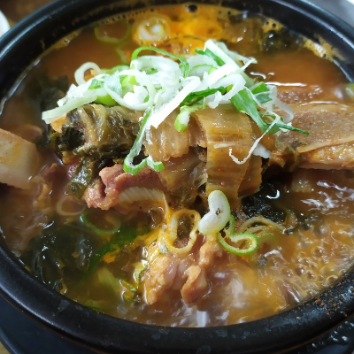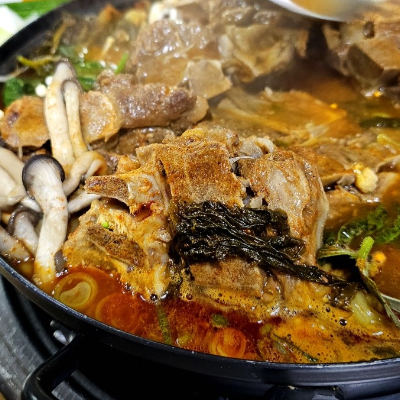 뜨거운 뚝배기에 보글보글 끓어 나온 뼈해장국입니다. 살도 많이 붙어있고 겨자소스에 포옥 찍어 먹으면 맛이 없을 수가 없어요.