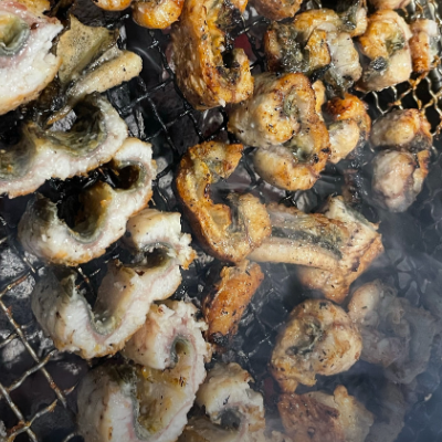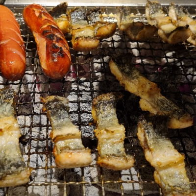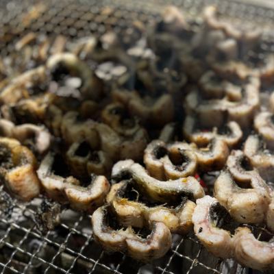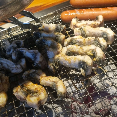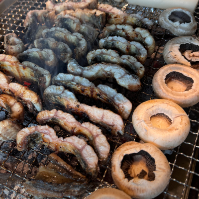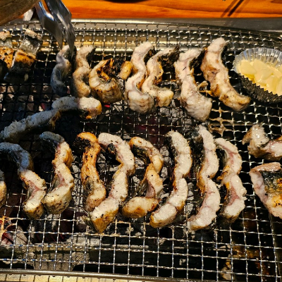 숯불에 구어 먹으니 장어는 쫀득쫀득 숯향이 솔솔나고 맛이 쫀득쫀득합니다. 생강채를 특별한 소스에 듬뿍 담가 장어랑 한쌈한삼 먹을수록 찐 맛이 납니다.