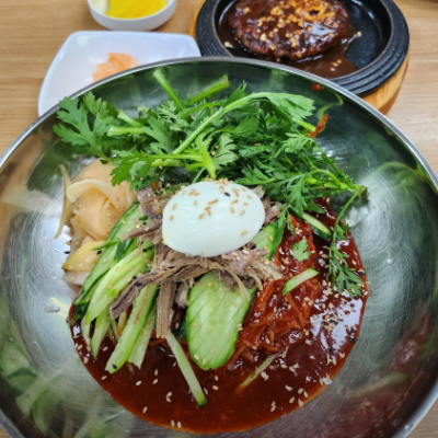 가성비 너무 좋고 쫄깃한 면과 새콤달콤 함이 계속 생각나는 맛 밀면뿐만 아니라 떡갈비 까지 맛 있다 아이들이 제일 좋아하는 떡갈비까지 완벽했어요.